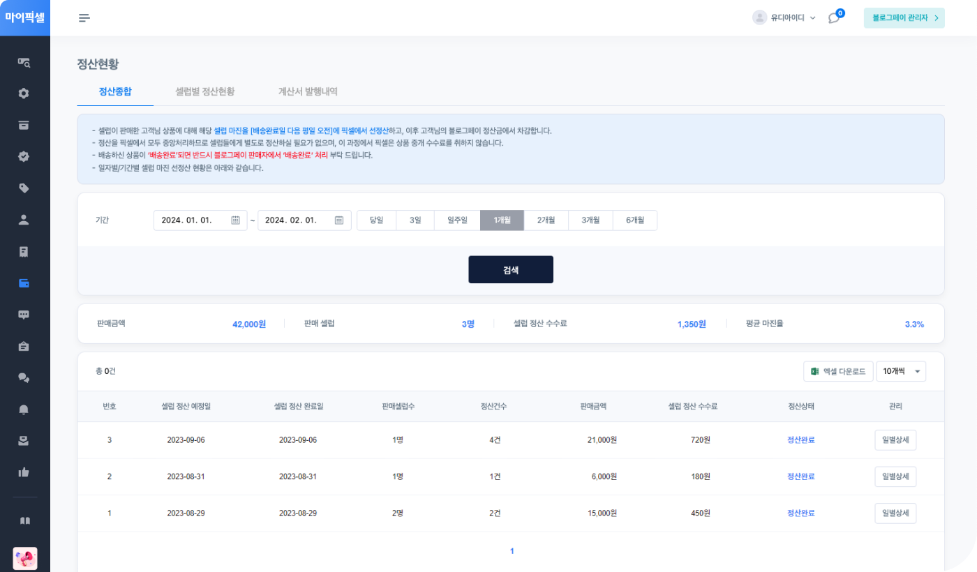 마이픽셀은 인플루언서 수수료 정산과 원천징수/세금계산서 발행 등을 모두 대행해 드려요. 상품등록하고 배송/CS만 하시면 됩니다.